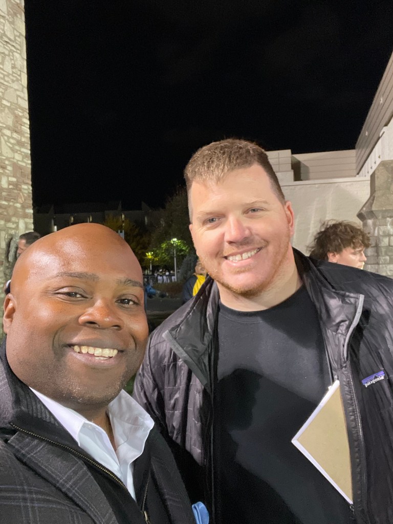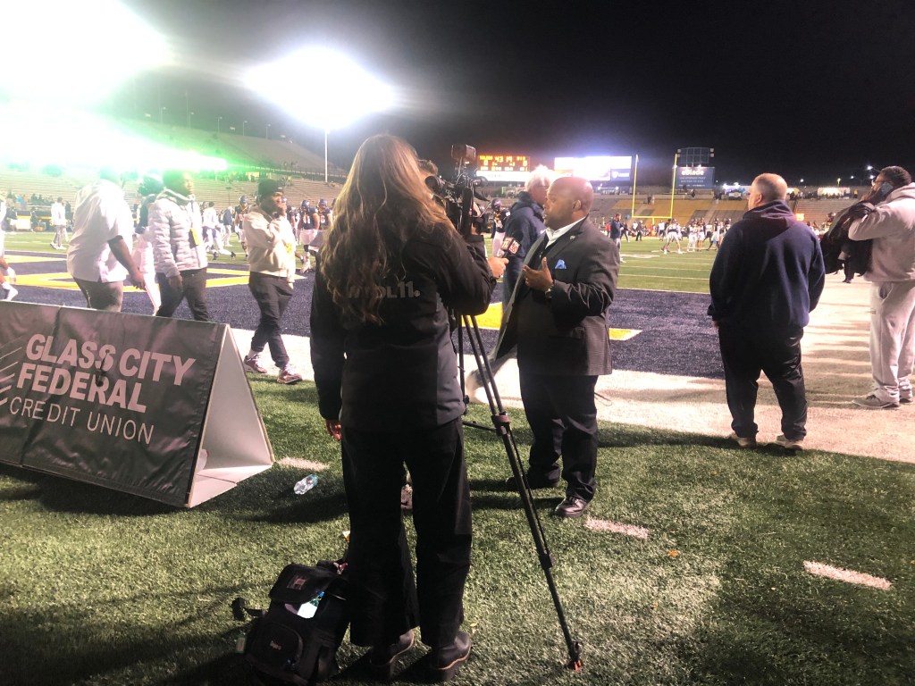 We made it back to the Glass Bowl about 90 minutes before kickoff. By then, the temperature had dropped and the wind had picked up. I decided to hang back a little and watch Bryan do his thing — meeting fans, checking in with staff, just being visible.