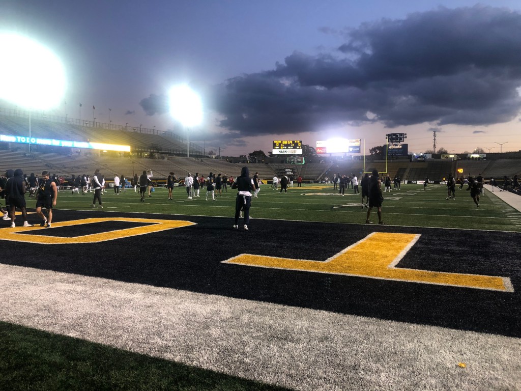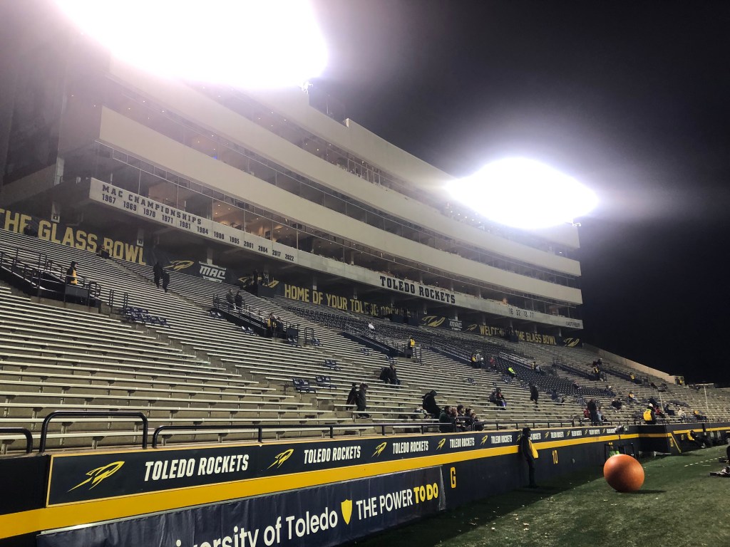The game couldn’t have started any better. After a great national anthem, Toledo took the opening kickoff to the house right in front of us. For a cold Wednesday night, the crowd was better than I expected and the fans were treated to early fireworks from that opening kick. Toledo went on to dominate the game with a score of 42-3 over the Huskies.